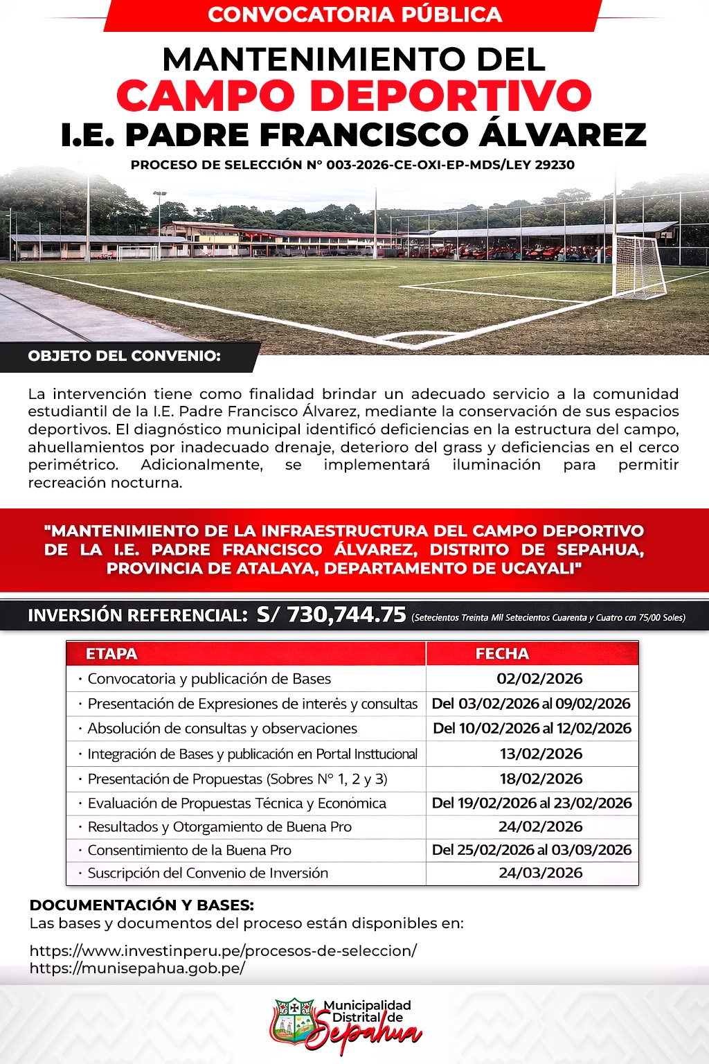 Estimados usuarios, para su mayor facilidad, se ha puesto a su disposición el formulario, que le permitirá el envÃo de documentos a la Municipalidad Distrital de Sepahua.​